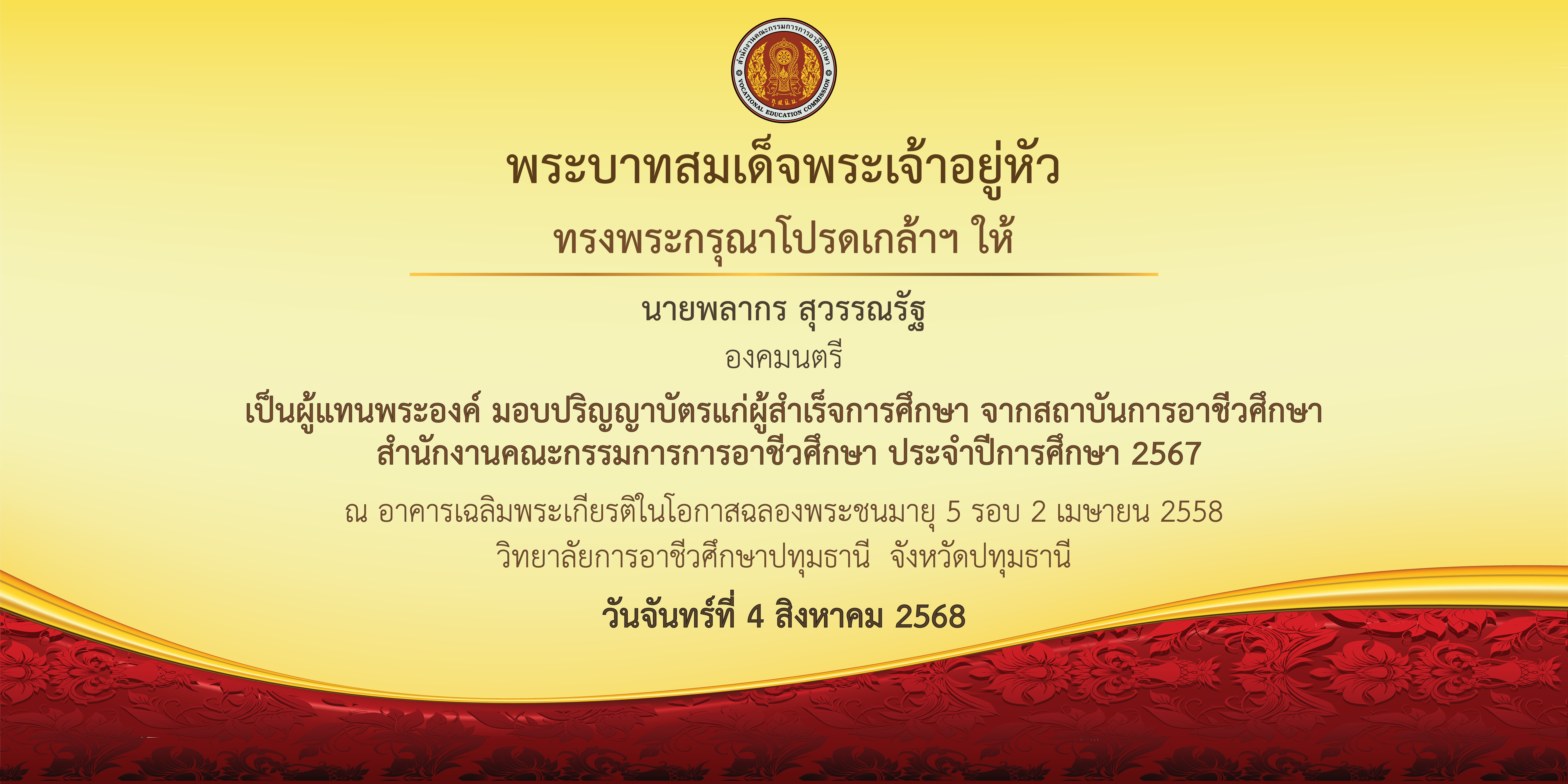 ไฟล์ประชาสัมพันธ์พิธีมอบปริญญาบัตรและสร้างการรับรู้การอาชีวศึกษาระดับปริญญาตรี สายเทคโนโลยีหรือสายปฏิบัติการ ประจำปีการศึกษา 2567 (สถาบันการอาชีวศึกษา 22 แห่ง)